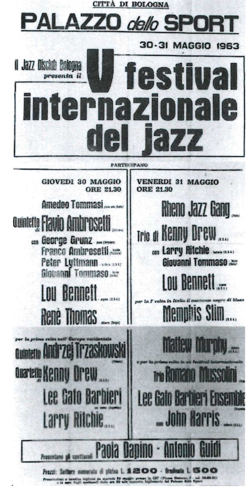 Il 30 e 31 maggio 1963 il Disclub di Alberti propose il V Festival che aveva come motivi di massimo interesse, oltre a René Thomas e Jacques Pelzer, l’organista Lou Bennett, il jazz d’oltre cortina di Andrzej Trazaskowsky, l’ancora poco conosciuto Gato Barbieri e, infine, vero trionfatore, il quintetto del grande Kenny Clarke.